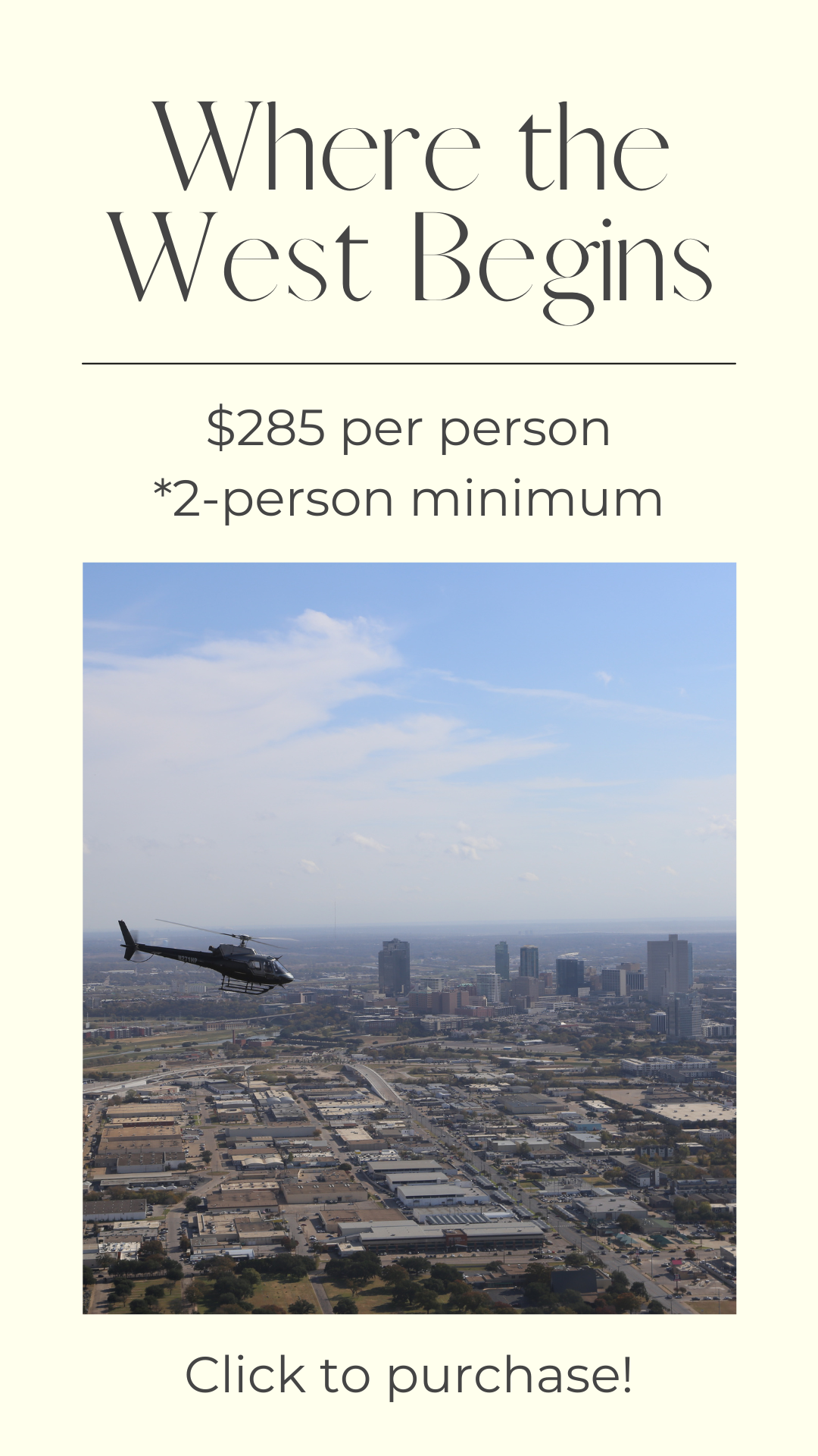 Get ready for a visually stunning experience in Downtown Fort Worth, with attractions like Sundance Square, Stockyards, Water Gardens, TCU, Fort Worth Zoo, and more. 30 minutes - MAX 280lbs per seat